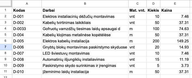 – Įsitikinkite, kad stulpeliai išdėstyti teisinga tvarka: Pavadinimas → Mato vnt. → Kiekis