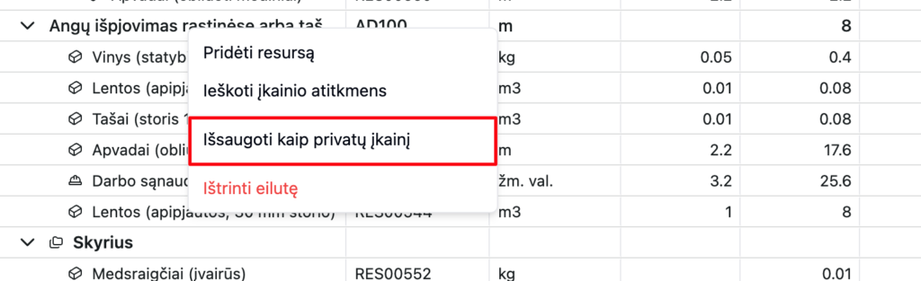 Jei redagavote įkainį (keitėte resursus, kiekius, matavimo vienetus ar kitą informaciją) ir norite jį naudoti ateityje: