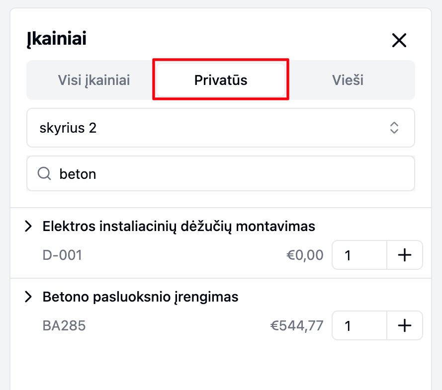 Išsaugotas įkainis bus matomas skiltyje Įkainiai → Privatūs.