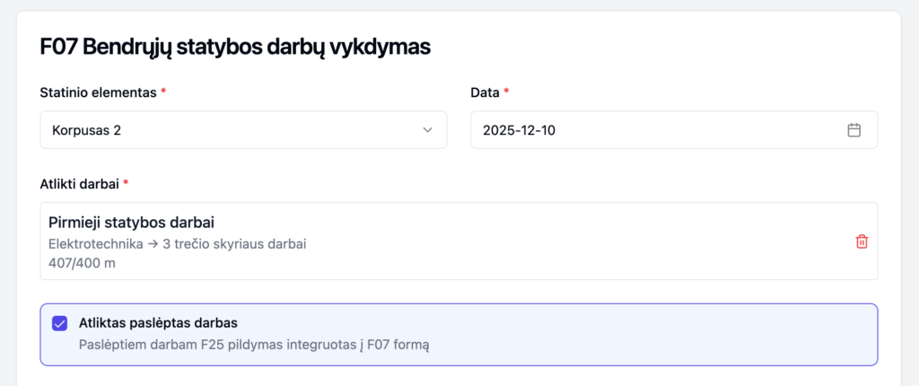 Pažymėkite varnelę „Atliktas paslėptas darbas“ – aktyvuosis F25 formos laukai.